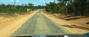 Det meste af highwayen ud til Undara var en bred grusvej med en smal stribe asfalt i midten af vejen. Når man så møder en modkørende, kører man ud på gruset med det ene hjulpar og så langt ud i rabatten som overhovedet muligt, hvis man passerer et roadtrain (lastbil med 3 hængere). De stopper nemlig ikke for noget og trækker heller ikke ud. Man skal passe rigtig meget på stenslag, og man holder bestemt afstand, for ellers kører man bare i en stor rød støvsky fra den forankørende. Så det var skønt at køre i en stor 4-hjulstrækker! Så behøver man heller ikke bekymre sig så meget om hullerne i vejen (og dem er der mange af).