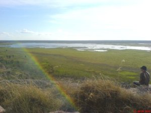 ind i bussen og videre til Ubirr Rock og se på gl. aboriginal klippekunst. Ganske imponerende. Nogle af malerierne var op til 5000 år gl, men man kunne faktisk stadig se, hvad de forestillede. Derfra klatrede vi op på en klippetop, hvor der var en helt fantastisk udsigt. Vi kørte også ud til et vådområde, hvor man normalt ville kunne se tusindvis af fugle i tørkeperioden, fordi det var et af de eneste steder med vand , men netop i år havde det regnet så meget op til tørketiden, at vandhullerne endnu ikke var tørret ud. Men kønt var der. Vi fik set de første Wallabies (små kænguruer), lidt fugle og lært om paperbark-trees.