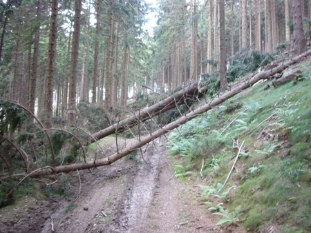 Det blev ikke meget bedre af at jeg på en første stigning mødte en vej, hvor en flittig skovmand havde fældet 10-15 træer ud over. Han var i gang med at flytte dem, men det kunne jeg ikke vente på, så jeg tog cyklen på nakken og kravlede op af en "næsten lodret" skråning.